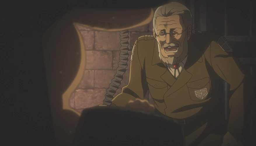 Nicht weit entfernt bereitet Erwin Smith den Aufklärungstrupp für die Reise zu den Reiss-Ländereien vor. Währenddessen bespricht er sich mit Dot Pixis, welcher ebenfalls einen Berater verhört hat. Er verrät Erwin, dass die Regierungsmitglieder offen zugegeben haben, dass die Reiss-Familie die Erinnerungen der Menschheit - abgesehen von einigen Adelsfamilien - umschreiben können und Erwin und sein Vater somit Recht hatten. Pixis warnt, dass die Reiss-Familie den gesamten Aufstand somit problemlos und ohne Widerstand rückgängig machen könnten, falls sie Erens Schrei in die Hände bekommen würden. Pixis spricht außerdem Zacklys Wahnsinn an und spricht davon, dass er schon vor dem Aufstand ahnte, dass Zackly gegen die Regierung vorgehen wollte. Er verrät, dass er im Gegensatz zu Erwin kein Mensch ist, der gerne wettet, und dass er im Gegensatz zu Erwin und Zackly als einziger die Anzahl der Überlebenden über sein eigenes Leben stellt. Er verrät, dass er Erwin unterstützt hat, weil er dies für das Beste für die Menschheit gehalten hat, aber sich ohne zu zögern gegen ihn und Zackly gestellt hätte, wenn dies das Sinnvollere gewesen wäre.