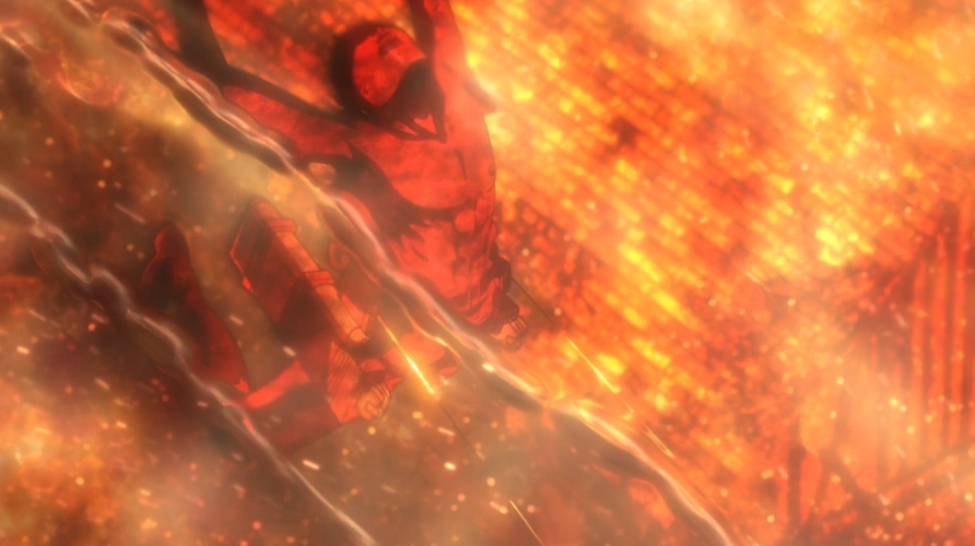 Levi ist seinerseits nicht willens, das Versprechen, das er Erwin gegeben hat, zu brechen und zieht daher entschlossen seine Klingen um die heranstürmenden Titanen zu töten und die Verfolgung von Zeke aufzunehmen. Aus den Überresten des Selbstmordritts erhebt sich derweil Flocke, der tatsächlich überlebt hat. Geschockt beginnt er, nach weiteren Überlebenden zu suchen. In Shiganshina sehen sich die wenigen Überlebenden nun mit sowohl dem kolossalen als auch dem gepanzerten Titanen konfrontiert. Armin, der den kolossalen Titanen genau beobachtet, erkennt, dass dieser nach seinem Dampfausstoß dünner geworden ist und daher vermutlich seine Muskelmasse verbrannt hat.