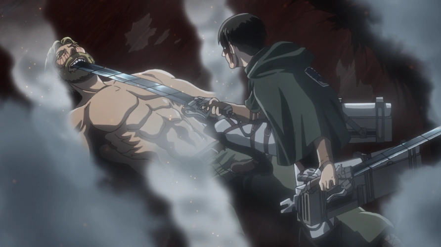 Daher sticht Levi die Klinge tiefer in Zekes Schädel, so dass sie unter dem Auge wieder heraustritt. Er will Zeke jedoch noch nicht töten, da er Titanenserum besitzt und damit einen seiner Kameraden - egal wie schwer verwundet er oder sie auch sein mag - in einen Titanen verwandeln und ihm Zeke zum Fraß vorwerfen könnte. Bevor dies geschehen kann, rast jedoch der Karrentitan heran. Er packt Zeke mit seinem Maul und sprintet davon, während Levi ihnen ungläubig hinterherschaut. Zeke schreit seinen übrigen Titanen zu, dass sie Levi töten sollen und murmelt dann, dass Levi ihn zwar fast besiegt hätte, seine Waffen aber fast aufgebraucht sind und er daher auch fallen wird, so dass die Krieger letzten Endes gewonnen haben.