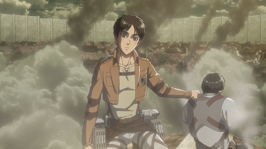 Der kolossale Titan nähert sich nun immer weiter der Mauer und Eren richtet sich langsam auf. Jean, Mikasa, Connie und Sasha schwingen sich derweil im Bezirk auf den gepanzerten Titanen zu, der zu ihrer Überraschung allerdings einfach an ihnen vorbeirast und es auf Eren abgesehen zu haben scheint. Dies ruft Mikasas Beschützerinstinkte wach und sie wirbelt herum, rast Reiner hinterher und feuert dem gepanzerten Titan einen Donnerspeer ins Knie, so dass dieser zu Boden geht. Da Reiner die gesamte obere Hälfte seines Schädels neu regenerieren musste, hat er kaum noch Erinnerungen an alles, was nach seinem Abschied von Berthold auf der Mauer geschah. Entsprechend erinnert er sich auch nicht mehr an die Donnerspeere und fragt sich verwundert, womit Mikasa ihn getroffen hat.