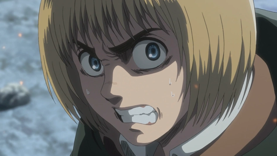 Armin hält sich dennoch weiter entschlossen fest. Er treibt sich selbst dazu, noch länger auszuhalten und Eren seinen Traum vom Ozean sowie sein Leben anzuvertrauen, da dies alles ist, was er noch aufgeben kann. Er glaubt, dass Eren es schaffen wird, den Ozean zu erreichen und wird schließlich von einem letzten kochenden Dampfstoß Bertholds davongeblasen, da er es nicht länger schafft, sich festzuhalten. Sein verkohlter Körper wird nach Shiganshina herabgeschleudert. Derweil suchen Mikasa und Connie nach einem Weg, Reiners Maul zu öffnen, als sich plötzlich die verwundete Hanji über sie hinwegschwingt und ihren letzten Donnerspeer in Reiners Kiefer feuert. Daraufhin klappt sein Maul auf und Mikasa feuert ihren verbliebenen Speer in Reiners Maul, so dass Reiner durch die Explosion aus dem Nacken seines Titanen gefetzt wird.