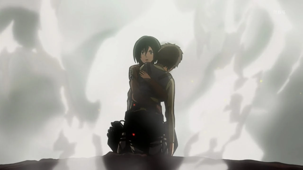 Schnell konnten sie ihre Gastanks wieder auffüllen und den Rückzug auf die Mauer antreten. Mikasa, Armin, Annie, Reiner, Berthold und Jean sehen zu wie der mysteriöse Titan noch immer gegen andere kämpft, doch er scheint zu verlieren, denn die Titanen beginnen ihn zu fressen, doch dann erscheint der Titan der Thomas gefressen hat und der Titan reißt sich los und packt den Titan am Nacken und schleudert ihn von sich. Mikasa wollte dem Titan helfen, doch sie stellten fest, dass er keine Hilfe brauche. Er könnte nützlich sein für die Menschheit, doch dann brach er zusammen. Doch anstatt einach zu verdampfen, tauchte Eren im Nacken des Titan auf. Mikasa eilt sofort zu dem Titan und Eren. Sie umarmt Eren und hört, ob er einen Herzschlag hat, dann bricht sie in Tränen aus. Armin stellt fest, dass die Gliedmaßen die ihm abgebissen worden, wieder nachgewachsen sind.