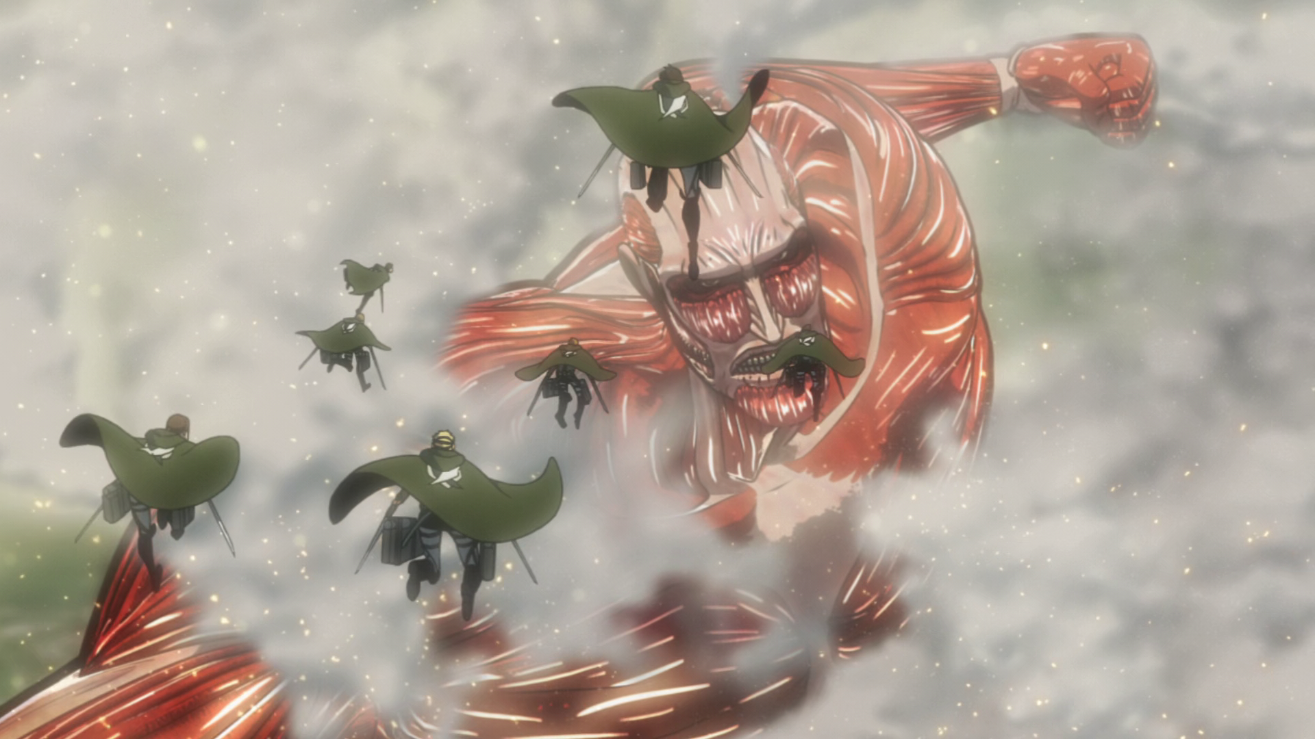 A Comandante de Seção Hange ordena um ataque ao Titã Colossal, e todos os soldados entram em ação. Os socos do Titã Colossal são evitados por pouco pelos soldados, manobrando atrás do monstro com grande agilidade. Os soldados de Hange logo reconhecem a velocidade de movimento incrivelmente lenta do Titã Colossal, deixando-o em grande desvantagem em comparação com suas manobras rápidas. Todos os soldados se alinham para atacar a nuca do Titã, mas no último momento Bertholdt libera uma enorme explosão contínua de vapor e ar escaldante, forçando os soldados do reconhecimento a recuar.