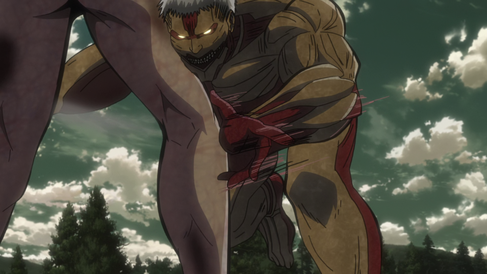 Eren ganha alguma esperança na situação, observando que Reiner e Bertholdt são, na verdade, aqueles que estão encurralados. De repente, o Titã Blindado troca a pele endurecida na parte de trás de suas pernas, ganhando mobilidade suficiente para atacar Eren de frente. Eren é derrubado e quase dominado, mas consegue jogar Reiner de lado.