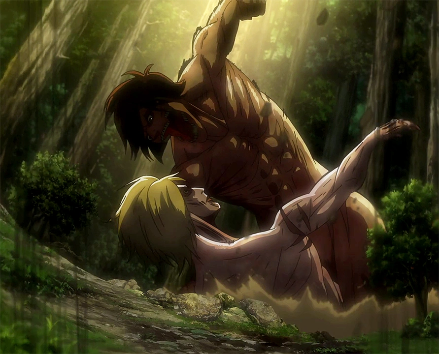 O Titã Fêmea, suspeito de ser o mesmo que Eren, ou seja, apenas um "ser humano em pele de titã", quase captura Eren antes de ser ela mesma emboscada e capturada. Eren e o resto de sua equipe, excluindo Levi, dirigem-se para fora da floresta, na crença de que a titã foi capturada e sua forma humana, revelada. Isso não acontece e a forma humana não identificada do Titã Fêmea mata um dos membros da equipe antes de voltar a se transformar em titã. Os três membros da equipe restantes dizem para Eren continuar correndo à frente enquanto eles tentam matar o Titã Fêmea. Eren insiste em ficar e lutar com eles, mas, novamente, é convencido do contrário e se retira. Os três são imediatamente abatidos e Eren, tomado pelo arrependimento, se transforma em Titã e encontra o Titã Fêmea.
