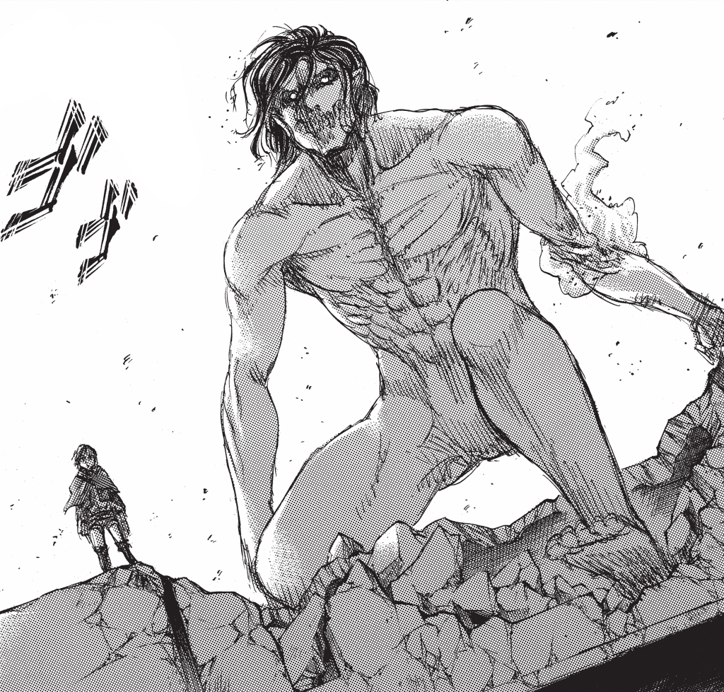 Mais tarde é revelado que no estômago do Titã Barbudo, o desespero de Eren em exterminar todos os Titãs desencadeia a sua primeira transformação, estourando o Titã Barbudo e prosseguindo para destruir os que encontrasse em seu caminho. No processo, ele salva a vida de Mikasa, abatida pelo luto de ter perdido seu irmão adotivo; e é atraído por uma equipe de seus colegas para ajudar a afastar o grupo de Titãs parados ao redor um quartel-general de armazenamento de gás comprimido, utilizado para alimentar o DMT.