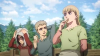 Mais tarde naquele dia, Falco está trabalhando com Gabi nos estábulos. Ele reitera que eles devem permanecer onde estão, expressando confiança de que Colt ou Reiner virão atrás deles. Ele vai almoçar com Gabi ao ar livre e descobre que eles estão hospedados em um orfanato para crianças que perderam os pais nos últimos quatro anos. Enquanto Falco e Gabi discutem, eles ficam surpresos quando Kaya menciona que sabe que eles são de Marley; Falco tenta inventar uma desculpa ao ver Gabi se aproximando de um forcado.