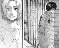 Mikasa leva Louise para a cela onde ela ficará, e Louise fica desapontada ao saber que não ficará na mesma cela em que Mikasa estava presa. Louise diz a Mikasa que não se arrepende de ter revelado os segredos da prisão de Eren para a imprensa. , explicando que ela acredita desde Trost que é preciso estar pronto para lutar quando ameaçado. Louise tenta apelar a Mikasa para ajudar a libertar Eren, mas Mikasa a interrompe friamente. Enquanto Mikasa sai, Louise a saúda.
