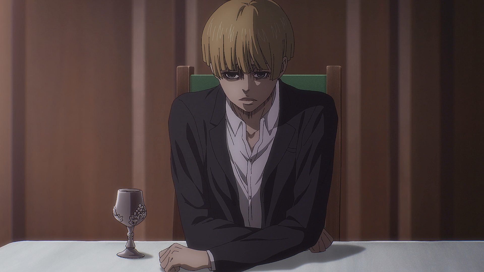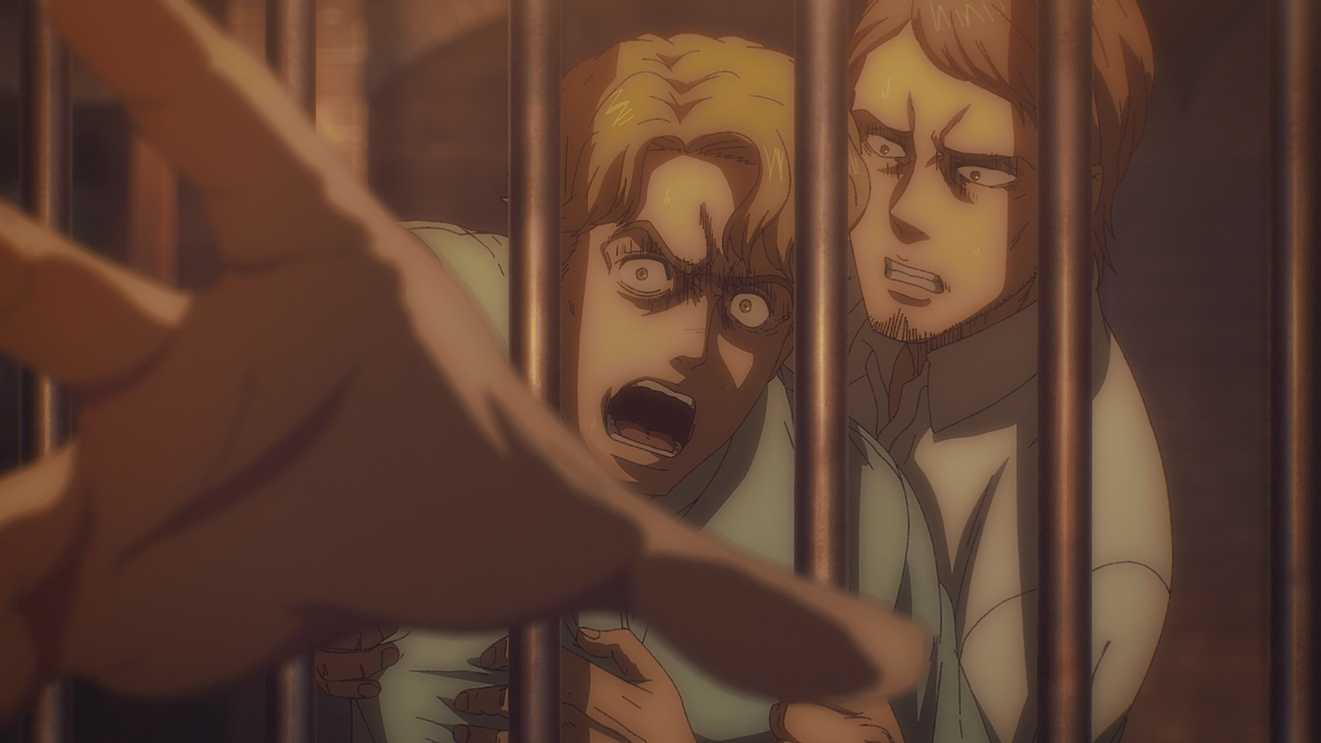 Enquanto isso, vários soldados do Reconhecimento tomam chá dentro de sua cela de prisão junto com Nicolo e a família Braus. Conny Springer pergunta a Armin Arlert se ele pode usar seu Titã Colossal para sair, e Armin responde que poderia, mas se ele fizesse, ele explodiria a cidade inteira e que seu Titã não é muito preciso. Jean Kirschtein pergunta por que Eren bateu em Armin no restaurante, e Armin explica como Eren feriu verbalmente Mikasa Ackerman, então Armin o atacou. Embora Jean force os detalhes, Mikasa se recusa a entrar em detalhes. Jean suspeita que Eren não faria isso sem um motivo e pergunta se há algo mais que Eren tem em mente.