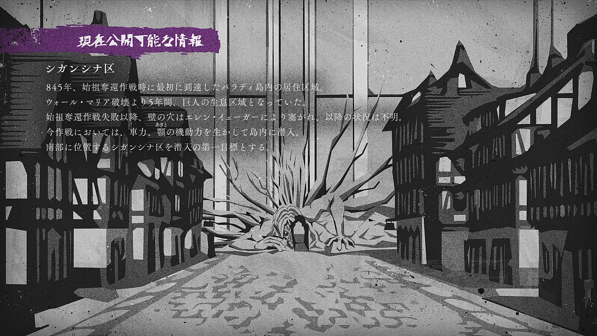 Distrito Residencial da Ilha Paradis que foi o ponto de chegada da Operação de Recuperação do Titã Fundador em 845. Foi habitat natural de titãs nos últimos 5 anos após a destruição da Muralha Maria. Desde o fracasso da Operação de Recuperação do Fundador, o buraco da parede foi fechado por Eren Jaeger e não se ouviu mais falar. Na operação atual, eles se infiltraram na ilha usando a mobilidade dos Titãs Carroceiro e Mandíbula. O primeiro objetivo era a infiltração no Distrito de Shiganshina ao sul da ilha.