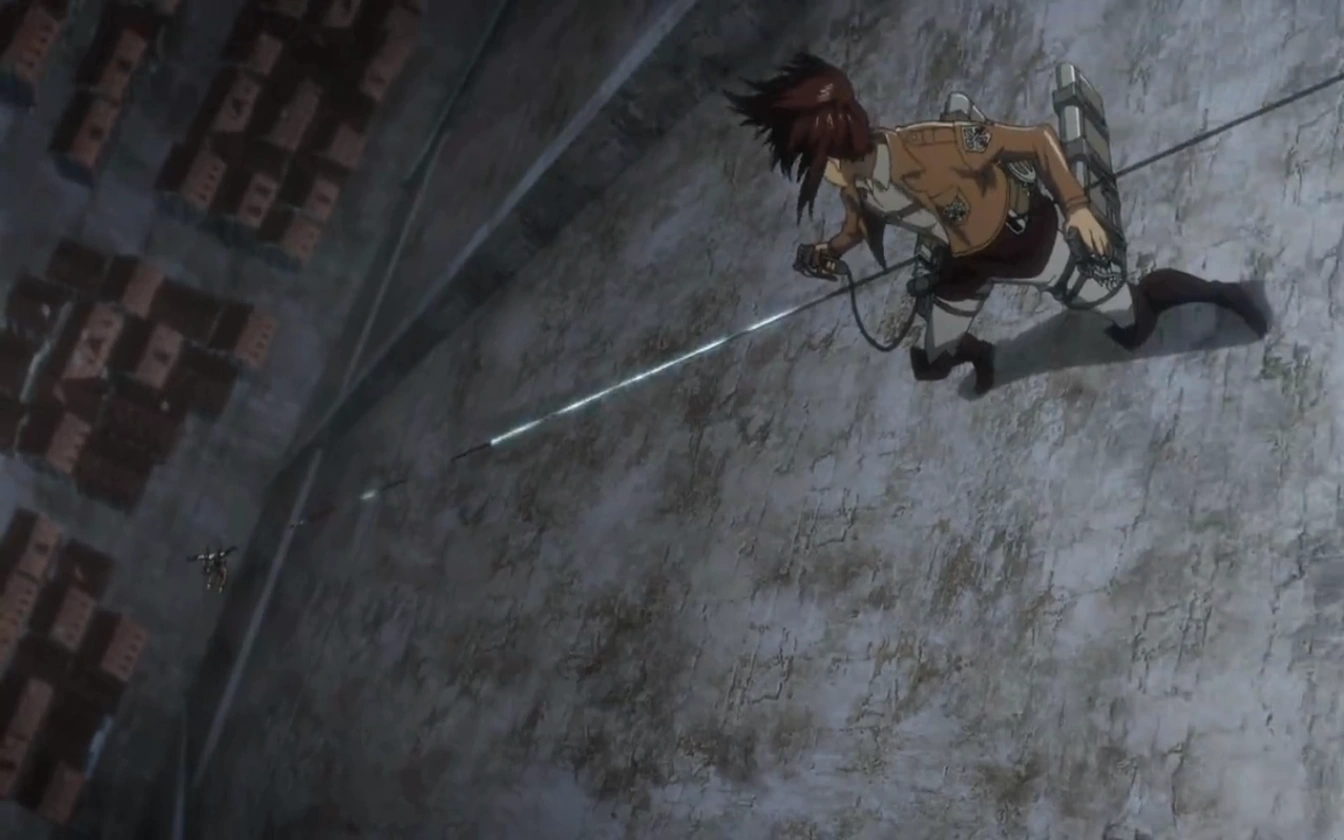 Após ser queimada pelos colossais e cair em uma cratera feita por eles, Hange Zoë se depara com seus falecidos companheiros quando acordou, inclusive Sasha, que é vista de costas para ela, olhando o avião voar.