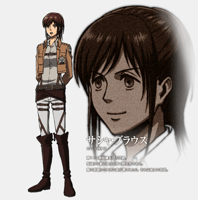 Sasha Blouse foi uma graduada do 104º Esquadrão de Recrutas, classificada como nono lugar entre os dez melhores de sua classe. Uma ladra compulsiva de comida, com uma maneira de falar educada demais, Sasha vinha da vila de Dauper (um distrito ao sul de Trost) e foi uma dos novos recrutas que decidiram se juntar à Tropa de Exploração junto com Eren, mesmo tendo muito medo dos titãs a princípio.