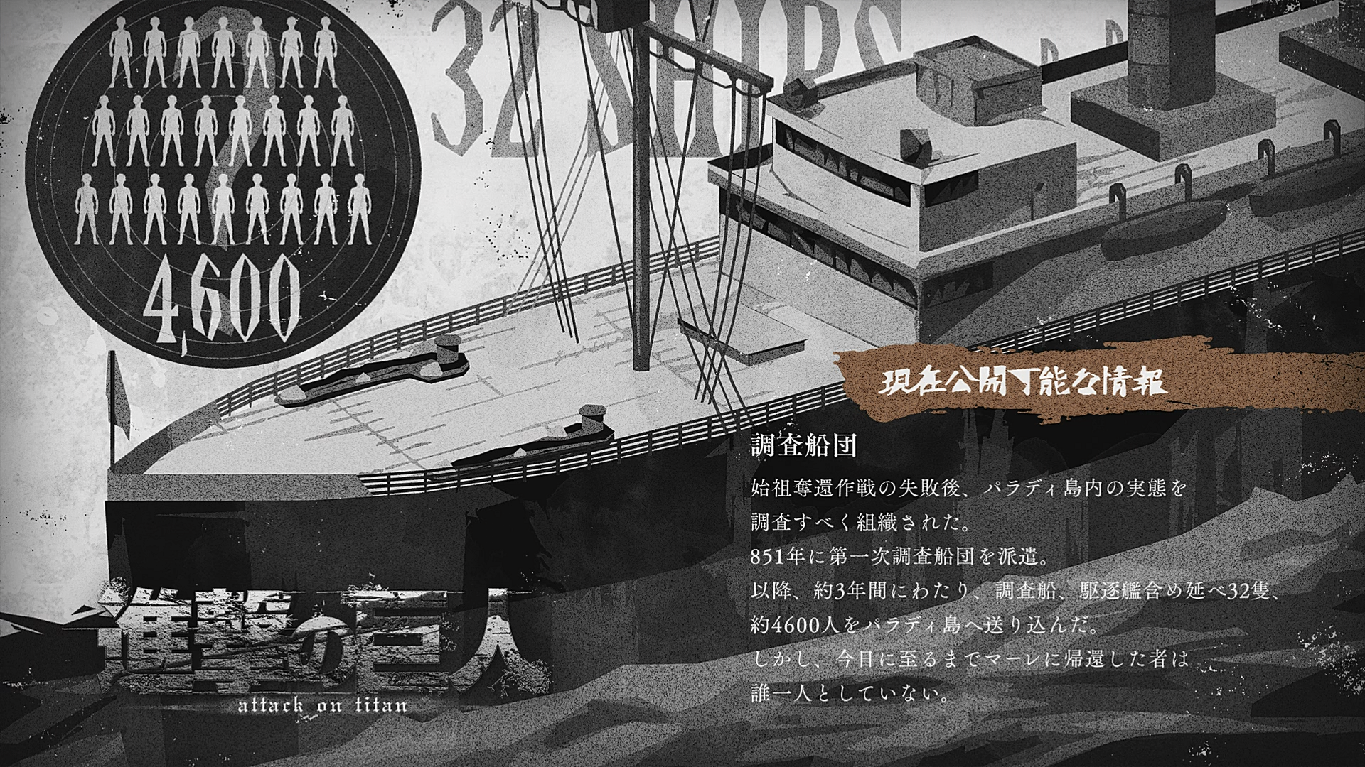 Depois do fracasso da operação para recuperar o Fundador, foram organizados os grupos de navios de reconhecimento para investigar a situação dentro da Ilha Paradis. No ano 851, foi enviado o primeiro grupo de navios. Desde então, se passaram cerca de 3 anos, e foram enviados para Ilha Paradis 32 navios de reconhecimento no total, incluindo torpedeiros e cerca de 4600 homens. No entanto, até hoje, nenhum deles retornou para Marley.
