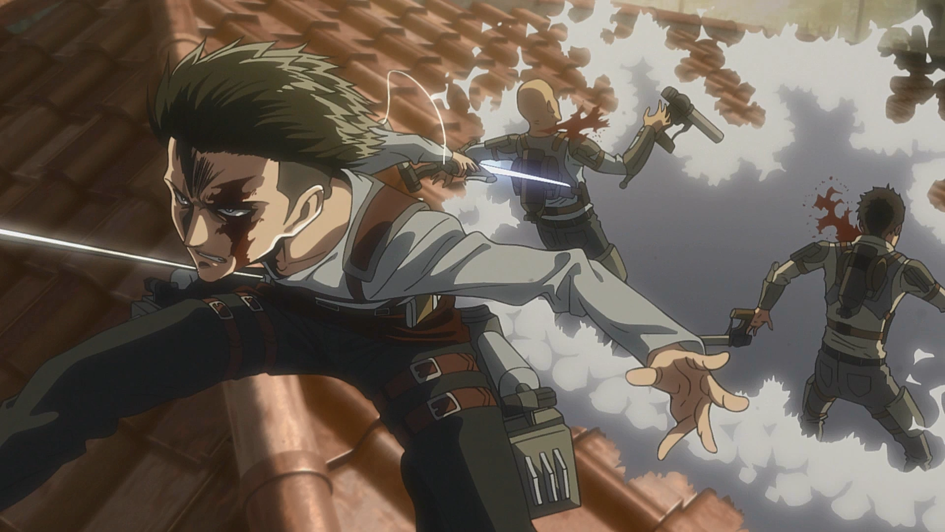 Поблагодарив владельца бара за его оружие, Леви выкидывает стул из окна в качестве приманки для окружившихся бар бойцов отряда Кенни. Это отвлекает внимание людей Кенни, а затем Леви выпрыгивает из окна и стреляет крюком УПМ в одного из солдат, тем самым убив его, после чего использует его тело как щит против шквала выстрелов от двоих других присутствующих солдат. Прежде чем они успевают перезарядиться, Леви мчится между ними и зарезает их своими клинками. Саша слышит выстрелы, Микаса доводит до всех сообщение капитана: отныне их враги - это не только титаны, но и люди. Отряд Леви направляется к зоне боевых действий.