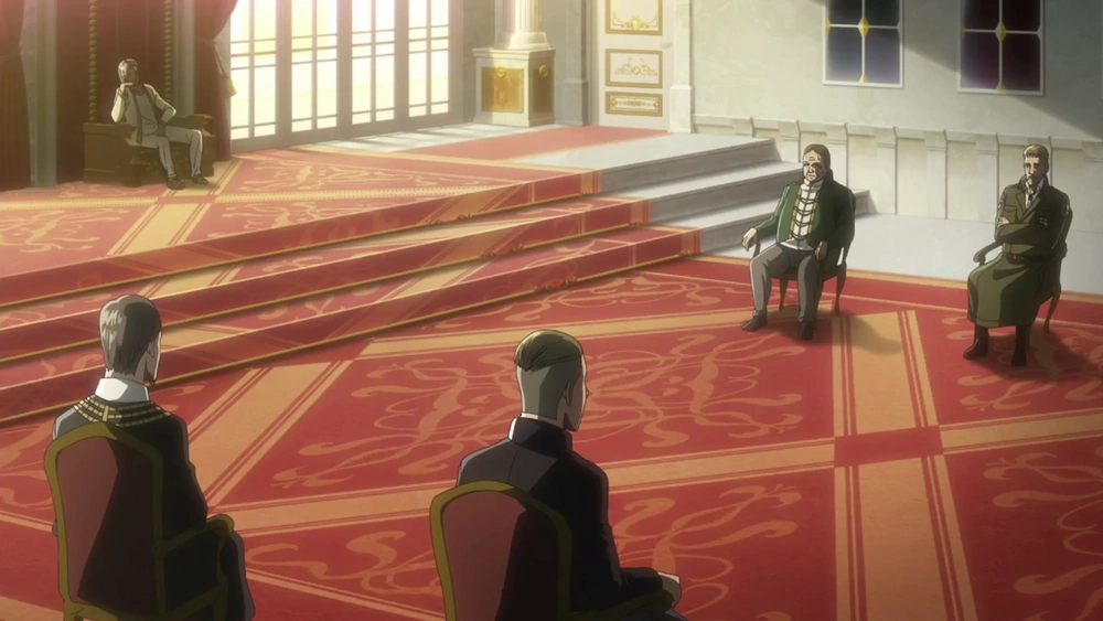 Тем временем в столице Митра, в тронным зале дворца королевские чиновники обсуждают о местонахождении Эрена и Хистории, и о дальнейшей судьбе Разведкорпуса и Эрвина Смита, они согласовали решить этот вопрос согласно людской хартии, как всегда они и делали. После чего приходит письмо от Рода Рейсса о том, что Эрвин и Хистория у него, и то, что он также позаботился о Разведкорпусе и Эрвине. Узнав эту информацию чиновники поняли, что уже от них ничего не требуется.