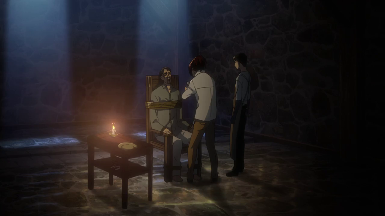 Далее нам показывают одну комнату в неизвестном месте, где Род Рейсс встречается со своей дочерью Хистории. Он обнимает её и извиняется перед ней, в то время как только-только очнувшиеся, связанный и завязанным ртом Эрен наблюдает за происходящим сбоку.