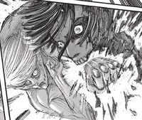 Жіноча Особина пробиває щелепу Атакуючого Титана кристалізованим кулаком