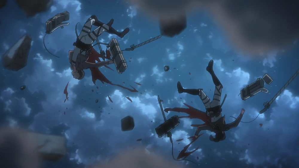 Через деякий час, замок був оточений групою Титанів, які рухаються вночі. Під час битви проти Титанів, він з Рене відділяються від Нанаби та Гергера, аби перевірити стан новобранців наверху замку. Після підняття на гору, вони чують звук чогось пролітаючого і в ту ж мить в них обох попадають уламки каміння кинутим Звіроподібним Титаном, вбивши їх миттєво.