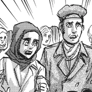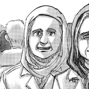 The troubled woman watches from afar as the uneasy Trost District citizens argue with Levi and his squad.[37] She later is among the Trost citizens who had heard the conversation between Flegel Reeves and a Military Police member, the group promising to attest against the MP's word.[38]