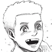Upon the return of the Survey Corps from their 57th Expedition to reclaim Wall Maria, this boy is seen with his sister Ellie, who is jumping up and down in an attempt to see over the large crowd of people. He calls for her, telling her to climb up a ladder with him so that the two of them can see.[30]