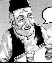 When Levi is attacked by Kenny Ackerman, he seeks shelter in this man's saloon. Recognizing Levi as a wanted man, he becomes terrified, and is only able to stand in fear as Levi and Kenny face off.[24]