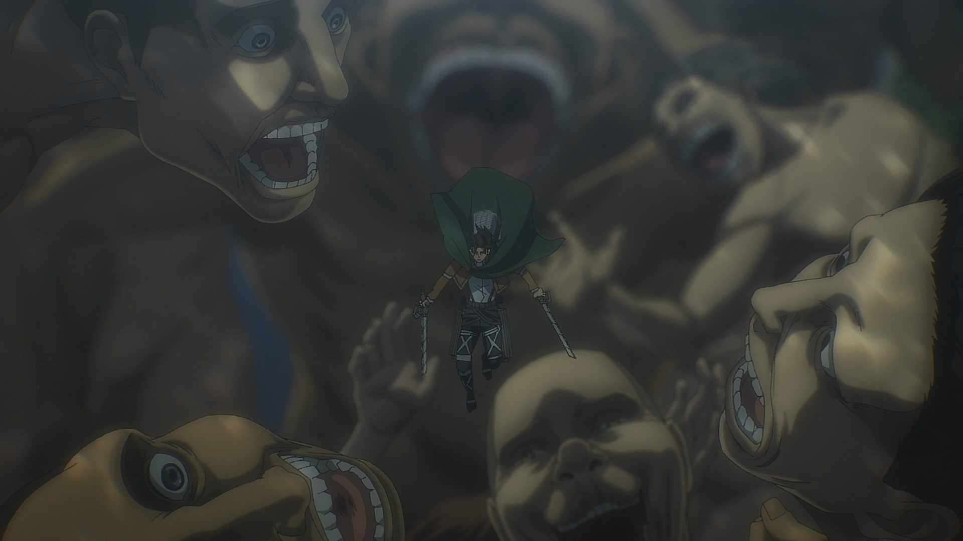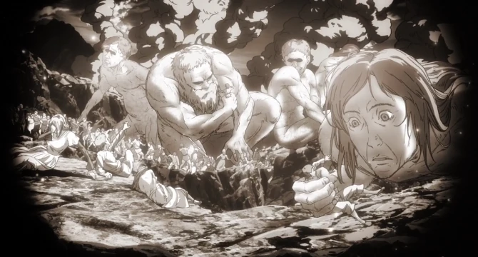 Above and Below (天地 Tenchi?) is the 75th episode of the Attack on Titan anime. It was produced by MAPPA. Floch Forster, Hange Zoë, and a number of Jaegerists are traveling to a Forest of Giant Trees when they hear the explosion caused by Zeke Jaeger triggering a Thunder Spear. As Zeke dies he thinks back to his shared mission with Tom Xaver and his meeting with his brother, Eren Jaeger. After Zeke succumbs to his wounds, a Titan crawls up to him and tears open its belly, stuffing his corpse inside. Meanwhile, Yelena has Dot Pyxis and other dissenting members of the military assembled in Shiganshina District. Eren goes to meet with the imprisoned Gabi Braun, to have her send out a distress call to Marley in exchange for saving Falco Grice. However, a disguised Pieck approaches Eren and claims she wishes to help him destroy Marley. As a proof of her intentions, she offers to show Eren the location of her fellow spies in Paradis Island.