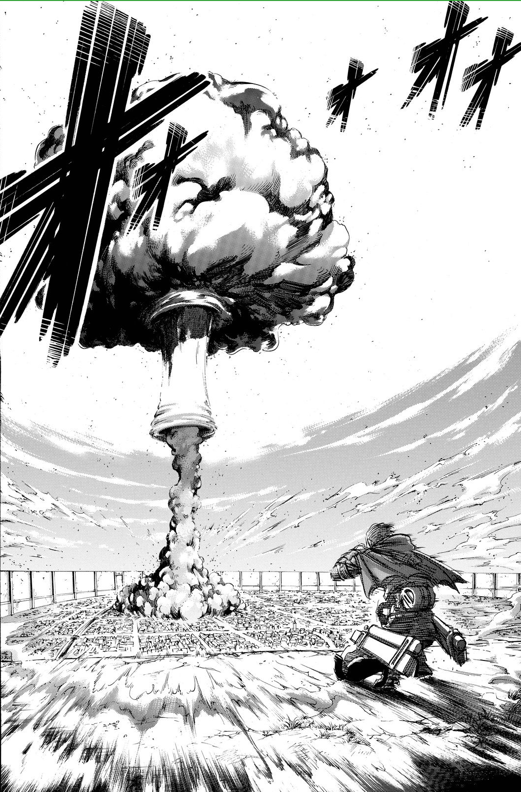 Later, after seeing what appears to be Titan vapor from inside the city, he and the soldiers that witnessed Eren's emergence from the Titan's nape scale the Wall to see what is happening. Over the Wall, they see Eren protecting Mikasa and Armin from cannon fire, with a shield made from the torso of his Titan form.