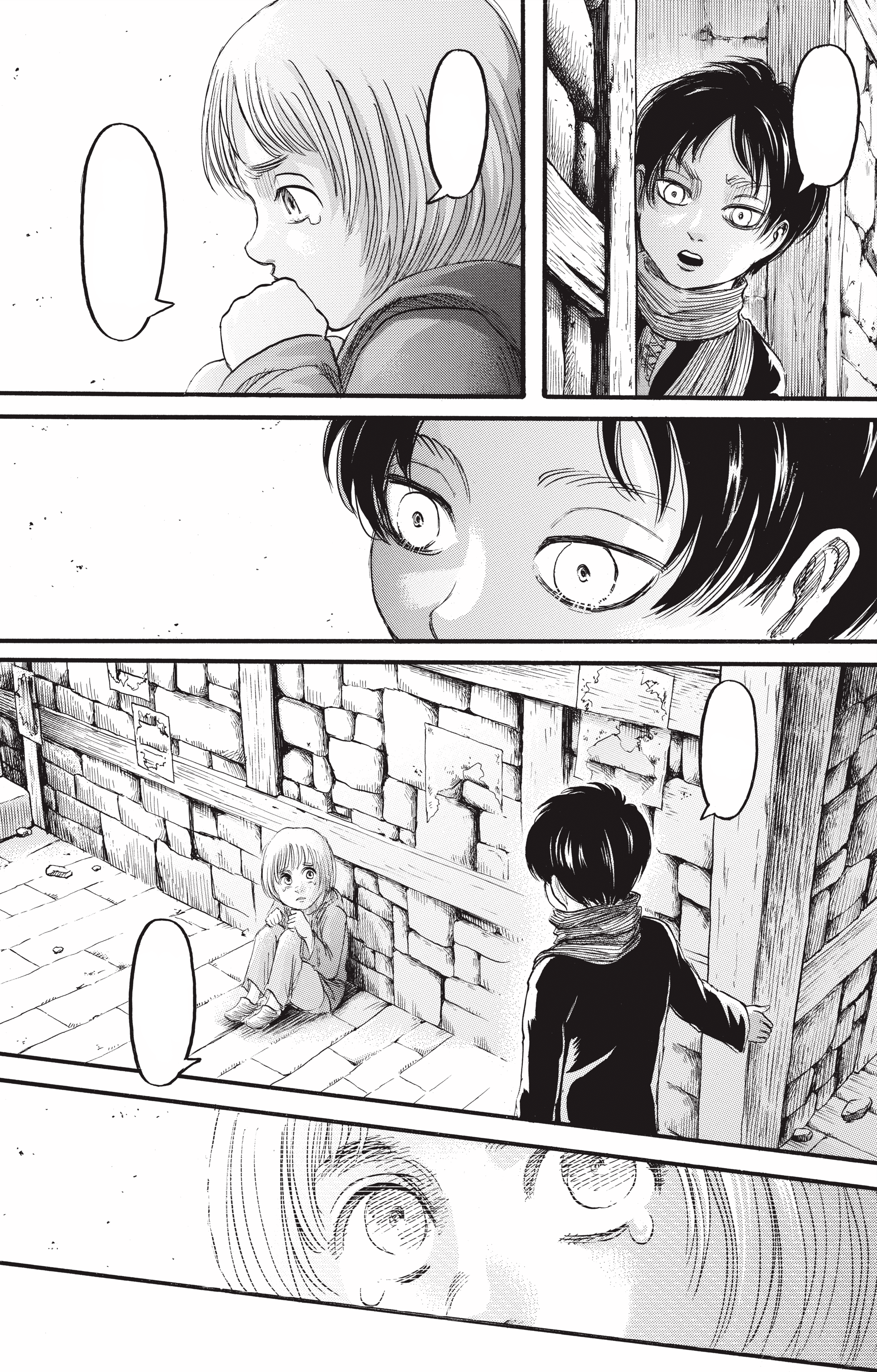 Several years ago in Shiganshina District, Armin sits against a building crying while bullies walk away laughing. Eren, peering from around the corner, asks Armin why he is allowing the bullies to treat him that way. Armin claims that he has not lost, since he is not running away. Stepping forward, Eren asks him what his name is.