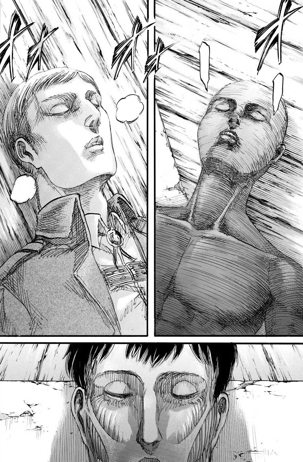 As Eren frantically tries to keep Armin alive, he begs Levi to save Armin's life with the Titan serum. Levi agrees, but is stopped by the arrival of the surviving Survey Corps recruit who is carrying Erwin's near-lifeless body. Seeing that Erwin is still alive, Levi announces that he has changed his mind, and will instead use the serum to save Erwin. The others object to this and turn on Levi while Zeke watches from atop Wall Maria with Reiner.