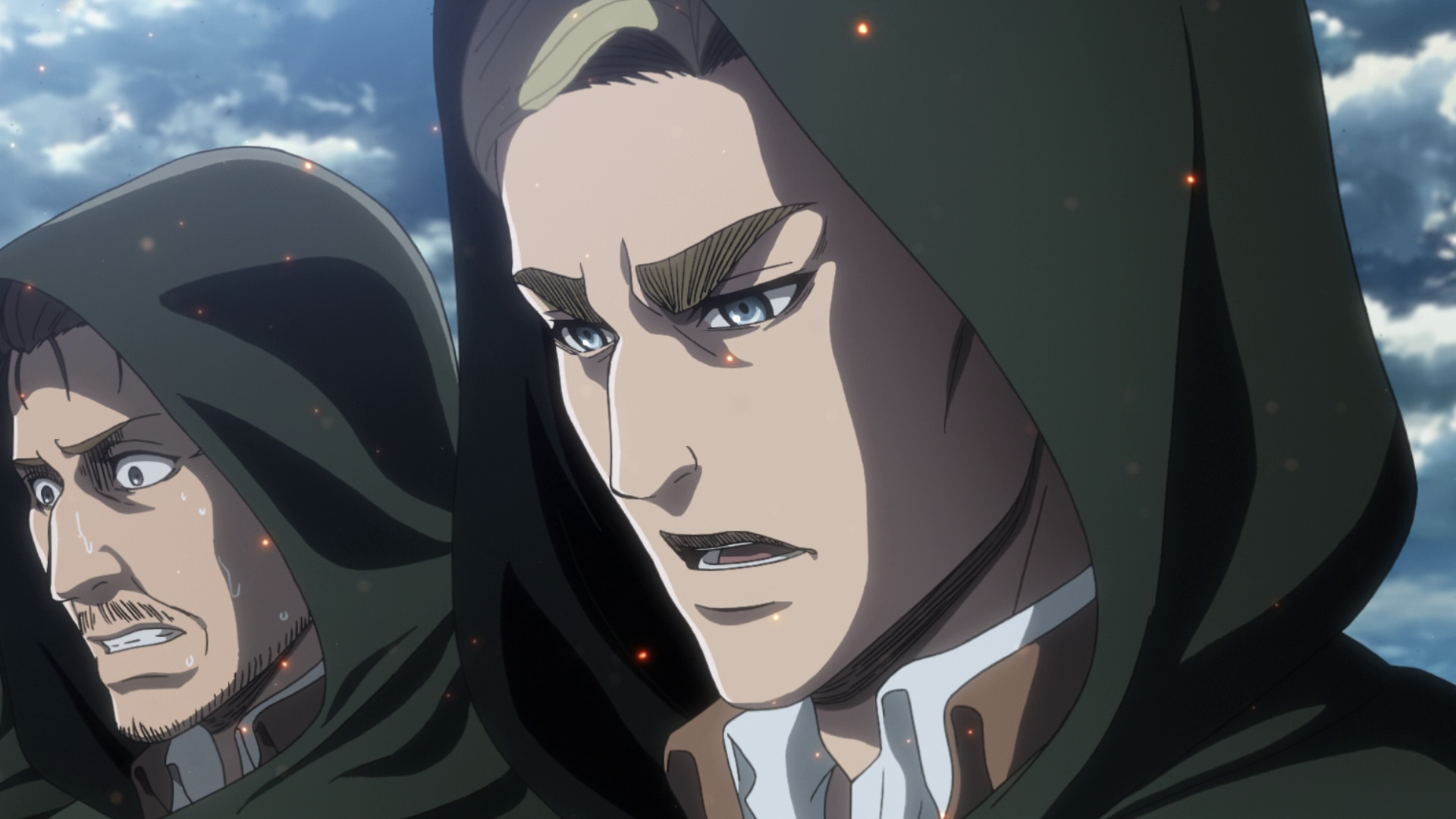 Erwin later appears at the recruitment drive where the 104th Cadet Corps choose their path. He makes an impassioned plea that the Scout Regiment and Eren represent the hope of humanity, although he is very realistic in telling them that a sizable number of them will die. His speech and other factors succeed in recruiting every remaining member of the top 10 graduates except Annie, who joins the Military Police Brigade.[16]