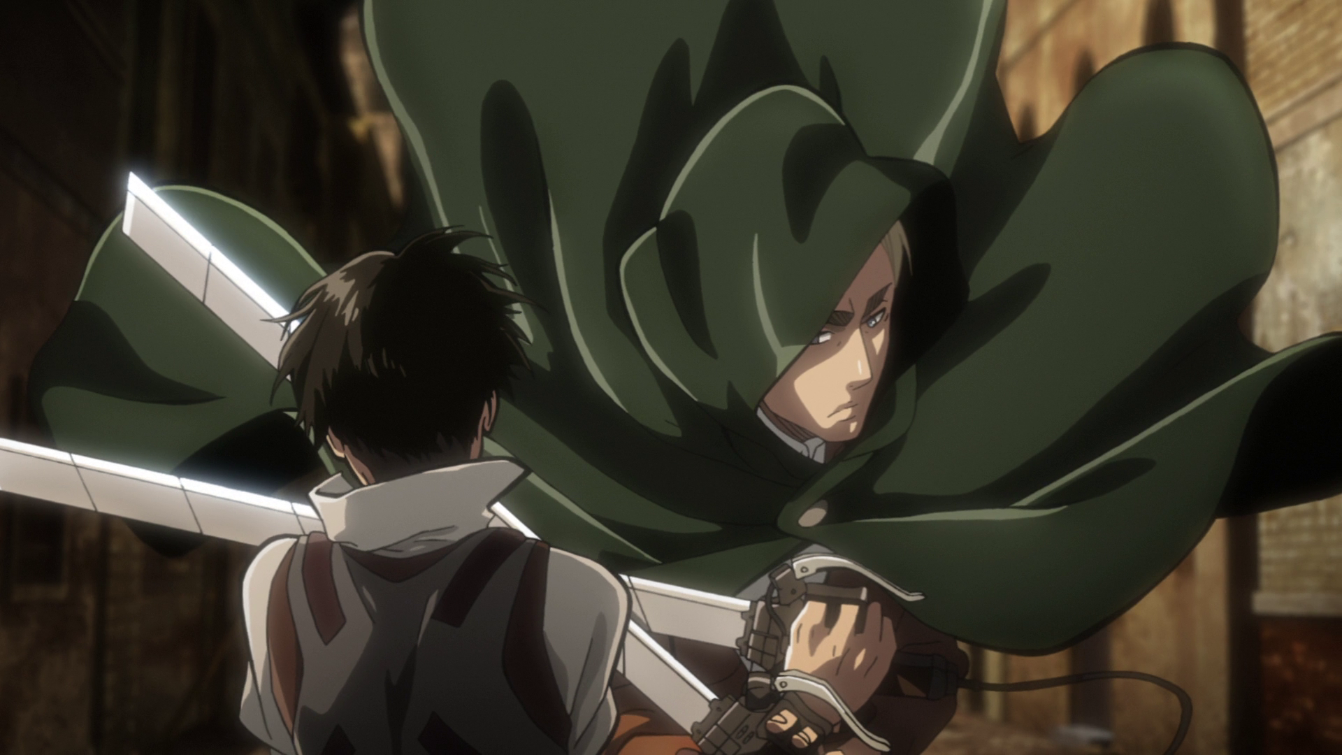 Erwin and his squad pursue Levi Ackermann, Furlan Church, and Isabel Magnolia in the Underground after they commit a heist. Levi, having been given warning that they would be after him, splits off from his friends and leads the squad on a good chase. He engages Miche Zacharius in combat with a knife before Erwin hurtles down from above to intervene. They clash and Erwin convinces Levi to surrender since his squad has already captured his friends.[8]