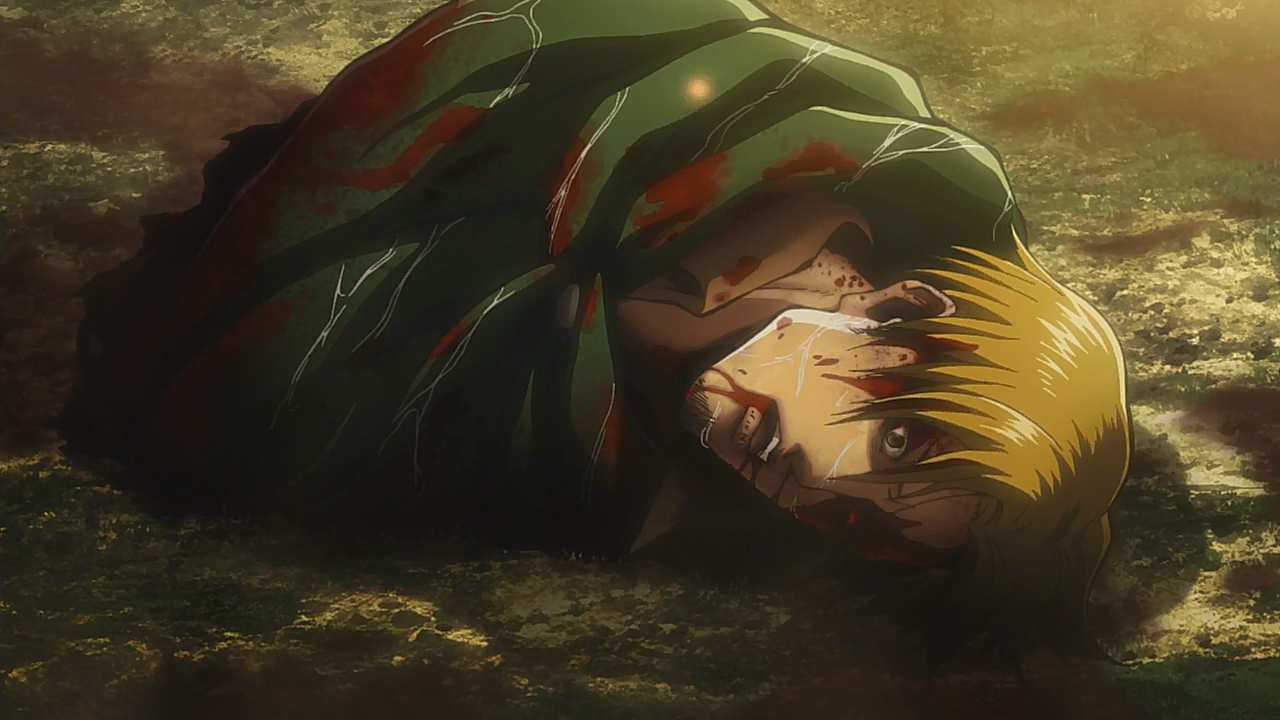 The scouts are forced to slow down when a storm sets in, with the heavy rain rendering signal flares useless. Flagon's group is soon set upon by an abnormal Titan, and Flagon is killed while engaging it. After the Titan is dispatched by Levi, Erwin finds Flagon's body before leaving it.[1]