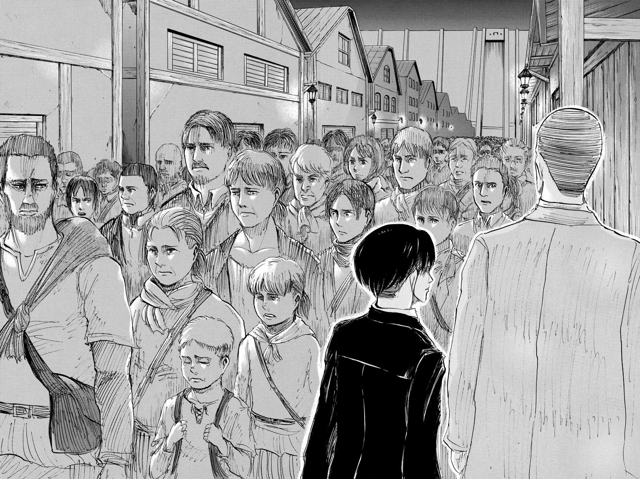 Nick is forced at gunpoint to travel with Levi and Hange to Ehrmich District.[7] After arriving in Ehrmich, Nick is horrified by the sight of the hundreds of refugees fleeing from Wall Rose. Nick tries to avert his gaze but Levi forces him to watch and accept the reality of his decision to withhold information. Nick meets with Hange and reveals that, although he is not at liberty to disclose everything he knows, he can point them to a member of the Survey Corps who can tell more: Krista Lenz.[13]