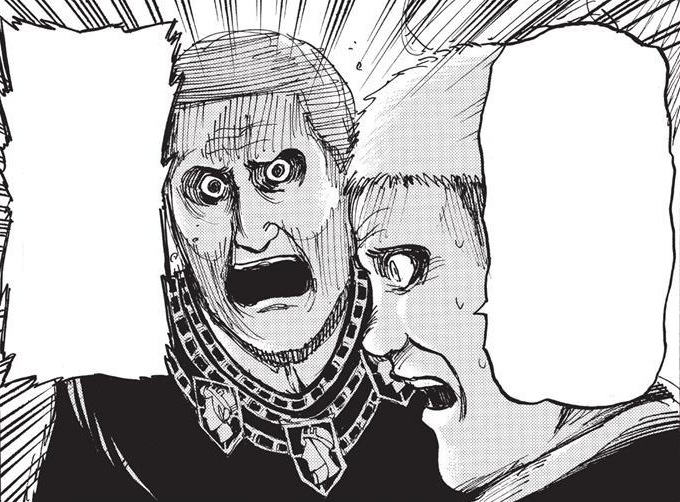 Minister Nick first appears at Eren Yeager's military trial. He and Nile Dok advocate for Eren's execution because of the danger his power poses. During the trial, a merchant suggests permanently sealing Wall Rose to stave off another Titan attack, enraging Nick. Calling the man a heretic, Nick argues that the Walls should not be altered, growing so intense in his argument that Darius Zackly is forced to silence him.[11]