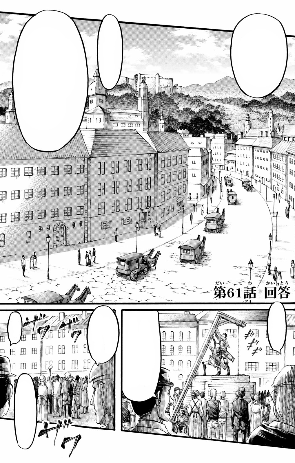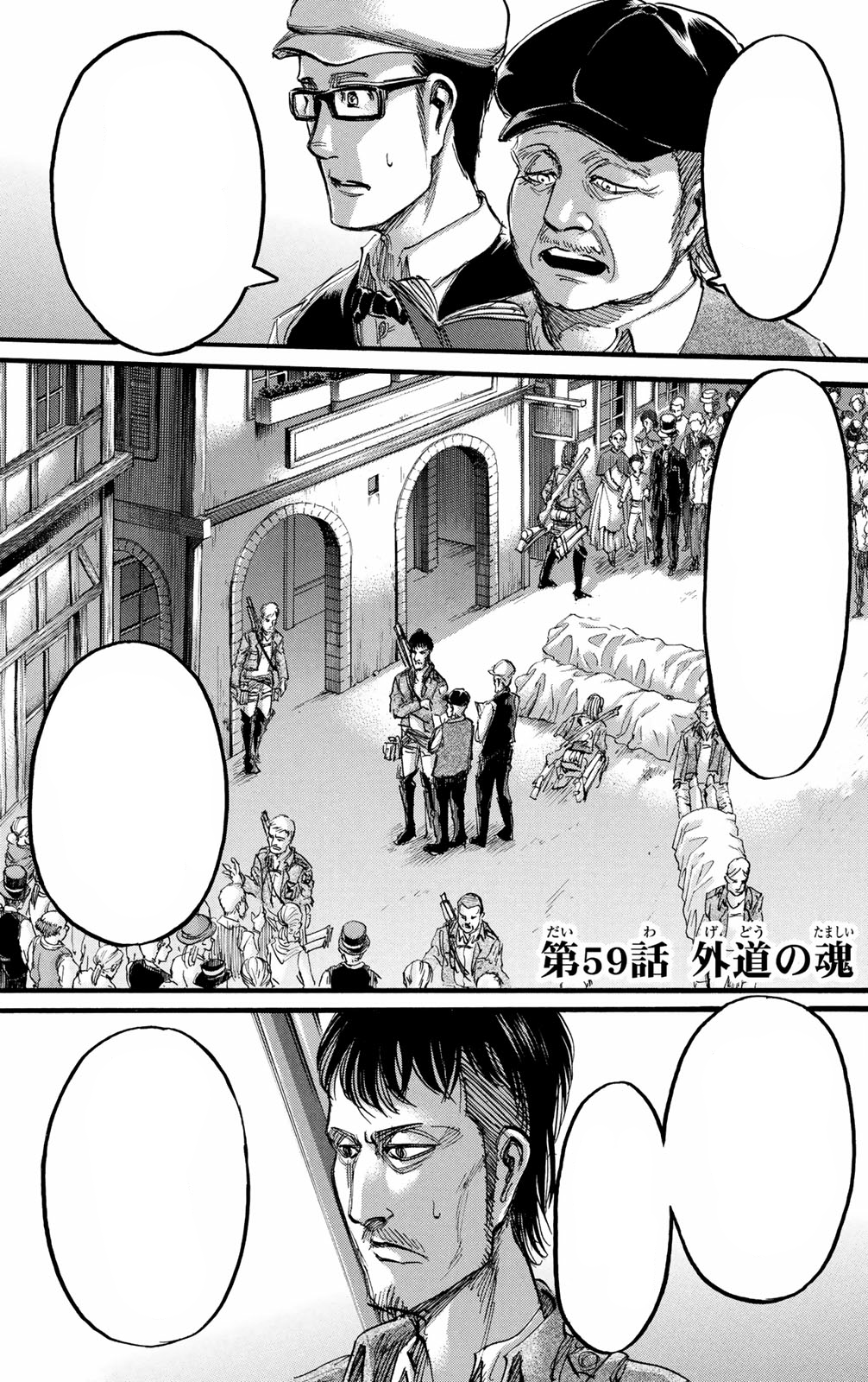 At the Berg Newspapers office in Stohess, writers Roy and Peaure discuss how false the paper is to make the MPs appear better and that if the truth were written, people would be killed. Hange then appears with Moblit and says they were going to maim their hands but then asks if they would write on them for just one day. Later in the Trost District, Flegel Reeves runs from three MPs and before he is to be killed, asks why they killed his father, Dimo Reeves. An MP tells him he betrayed them and if he had not agreed to kidnap the Survey Corps members he would be killed anyway. Hange and Moblit then jump down and take out the MPs, revealing many Trost citizens to attest to their words. Flegel then claims ownership over the Reeves Company and Hange asks Roy and Peaure to print the story until Roy disagrees, saying his family will be killed. Over in the capital. Erwin Smith is presented beaten and kneeling in front of King Fritz and the Assembly of the Royal Government. | |||