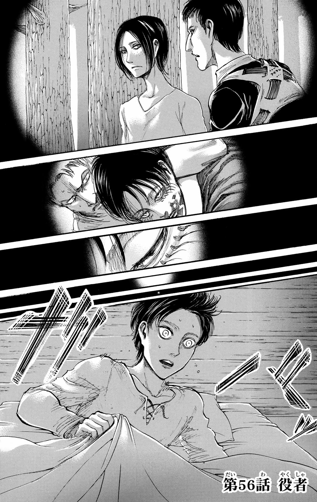 Erwin Smith presents Dot Pixis with his proposal to overthrow the Royal Government. The commanders discuss the risks involved in doing so, and Pixis challenges Erwin to convince him of the value of his plan. While they wait for a messenger to arrive with news crucial to the plan, Erwin reveals his backstory and the event that shaped his life: his father's death at the hands of the government. Hange and Levi carry out the interrogation of the captured members of the Interior Squad, brutally torturing Djel Sannes for information. His screams disturb the younger members overhearing this. They realize just how far they may have to go to win. Sannes finally breaks and discloses a crucial secret: the Reiss family is the true royal bloodline. Armed with this information, Erwin finalizes his plan by proposing that they install Historia as the new Queen.