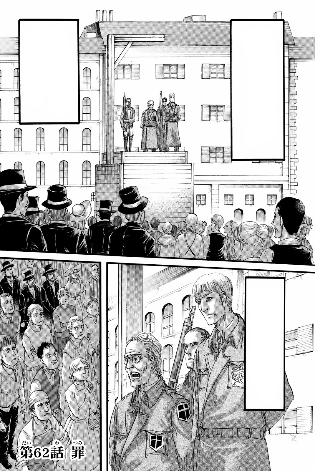 Erwin's public execution is being prepared. Meanwhile, he has a conversation with the King and the Assembly. Erwin tries to explain that the Survey Corps defends mankind and that the fall of Wall Rose would cause a civil war but the Assembly ignores him. Suddenly, a Garrison soldier reports that Wall Rose has been breached. The Assembly decides that the refugees must not enter Wall Sheena. This confuses the soldiers, making Nile Dok disobey them. It is then revealed that there is no breach and it was a plan made by Dot Pixis to show the nobles' true nature. The confusion ends when Darius Zackly arrests the nobles and exonerates the Survey Corps. In another place, Levi's Squad are informed by Hange accompanied by Hitch and Marlowe that they are being spared for the crimes they were framed for. This allows them to carry on with their more important duties, rescuing Historia and the restrained Eren.