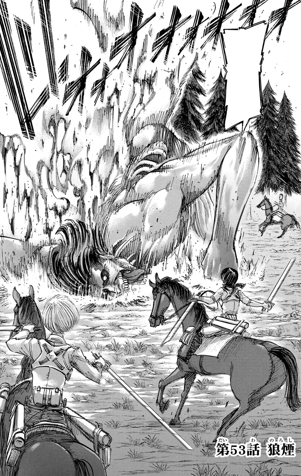 They are joined by Connie and Hange who reveal the possibility of Titans being humans completely fused within their body. This theory is supported by the events in the Ragako Village as all the humans have seemingly turned into Titans, including Connie's parents, much to his sorrow. Levi then reveals to Erwin that his team has been remade with several members of the 104th Training Corps members in order to watch over Historia and Eren. Far away from any civilization, Eren is reminded of the original Levi Squad as his new team bickers among themselves. | |||