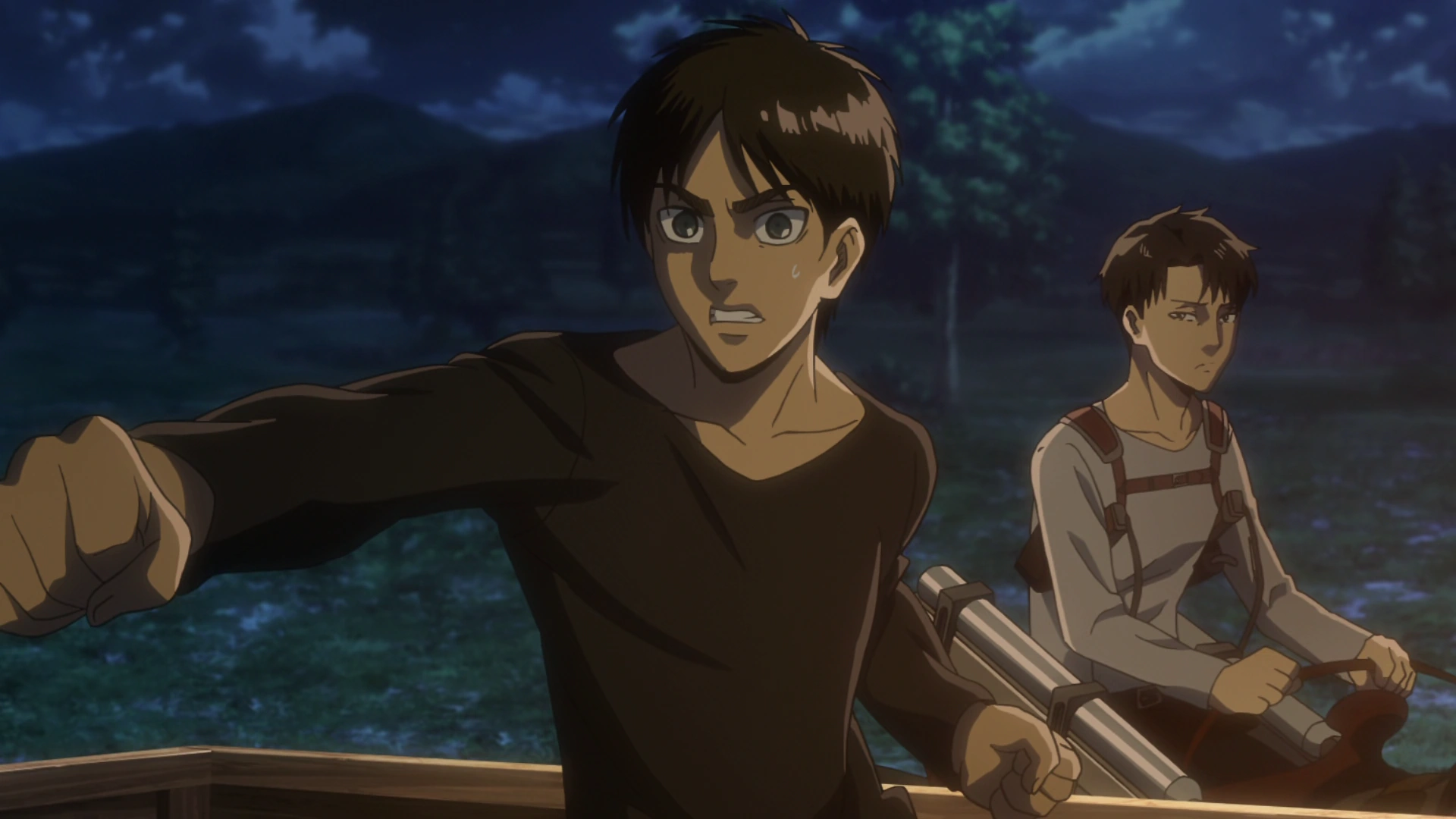 Eren looks down into the city at a group of kids below and remarks on how they remind him of himself and his friends on that day when the Colossal Titan appeared. Armin Arlelt agrees, but reminds Eren that there is a difference this time. Now there are soldiers who stand on the Wall to face the Titan, and they are those soldiers. Eren turns and watches Mikasa Ackermann stack barrels of gunpowder at Hange's direction, and remembers how they tried to free his mother from the rubble before the Titan came.
