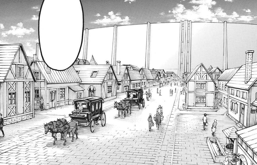 The Reeves Company is given the responsibility to reconstruct the district by the military. However, in 854, the military forcefully evacuates all the citizens of Shiganshina. This order spreads confusion around the populace.[16]