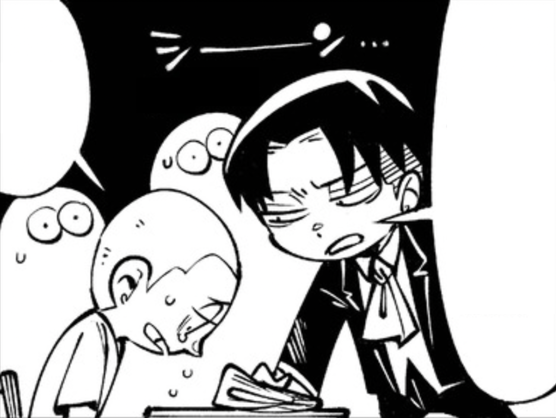 A few moments later, Levi instructs Connie to recite the answers to the homework aloud. However, Connie admits that he forgot to answer it and consequently gets reprimanded by Levi. Levi situates Connie's chair beside the teacher's desk and announces that he will be sitting there for the rest of the period. As Connie fearfully replies to his punishment, Petra, Gunther, Oluo, and Eld, a group of older students, become amazed by the scene, calling Connie's new seat the best in the house. Eld recalls how they used to pretend to forget the homework on purpose just to sit beside Levi's desk.