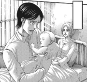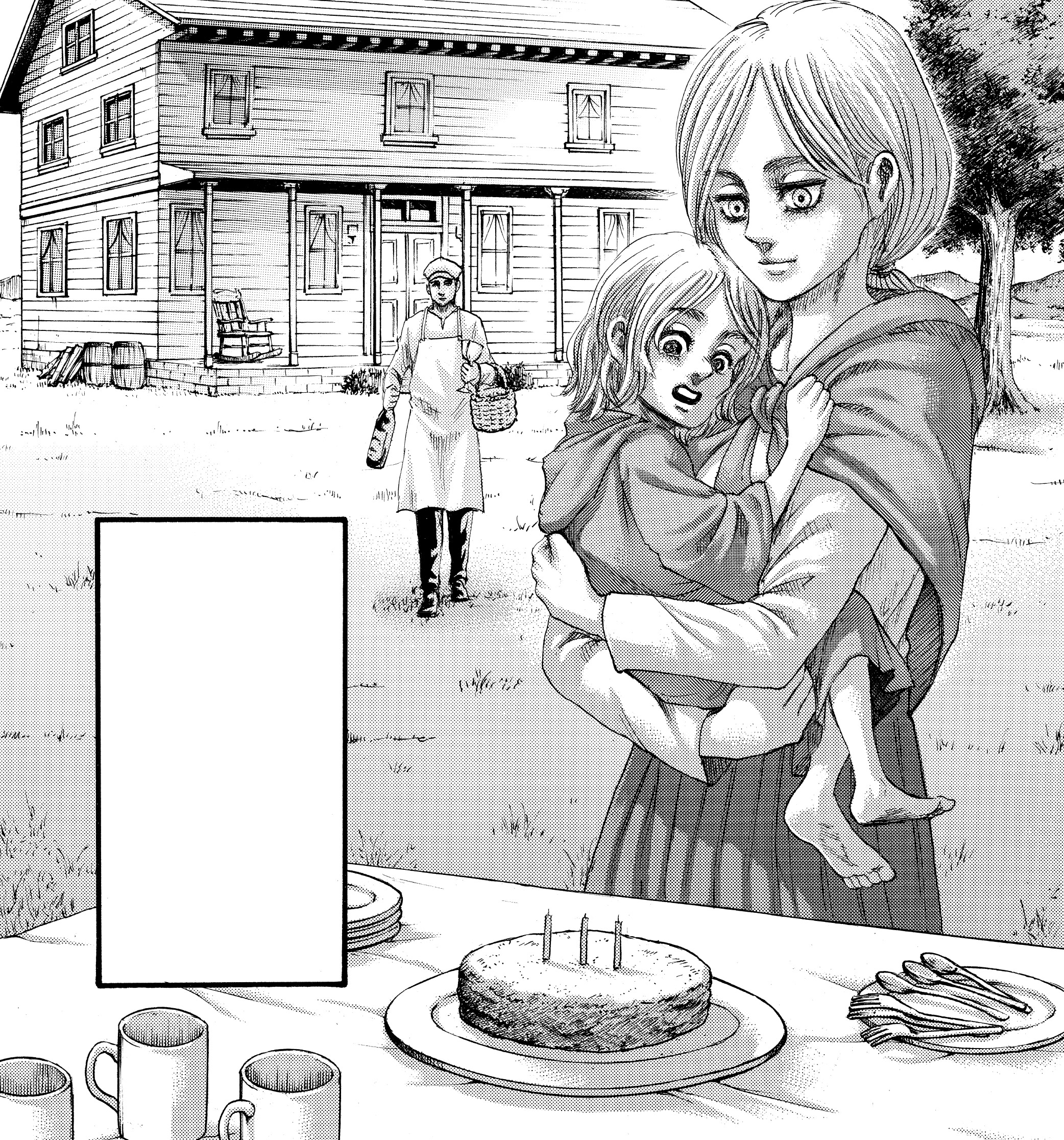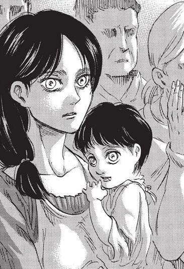 January 15 - Historia Reiss is born to Rod Reiss and his mistress Alma.[85][82] February 10 - Mikasa Ackerman is born to her father and mother.[86][82] March 30 - Eren Yeager is born to Grisha and Carla Yeager.[86][82] |