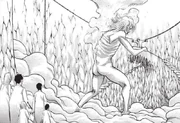 Annie disrupts the expedition as the Female Titan to search for Eren.[146] Commander Erwin leads her into a Titan Forest, and successfully uses special target restraining weapons to capture her.[147] However, using her shriek to attract Titans to her,[148] she manages to escape, killing four members of the Special Operations Squad in the process.[149] Eren Yeager battles Annie in the Titan Forest but is defeated and kidnapped by Annie. Before she can escape, Mikasa and Levi Ackerman arrive and rescue Eren.[150] The Survey Corps retreat to Karanes District and are ordered to surrender Eren to the Royal Capital. Annie returns to her post at the Military Police Brigade headquarters in Stohess District.[151] The Survey Corps begins to suspect that Annie Leonhart is the Female Titan. Erwin Smith devises a plan to capture her in Stohess District.[152] |