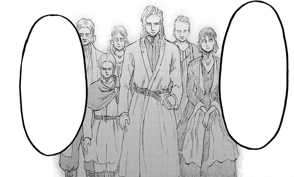 | c.837 | Grisha Yeager identifies the Reiss family as the true royal family and locates the Reiss chapel. However, he chooses to set aside his mission to take the Founding Titan and instead remains with his new family.[87] | |