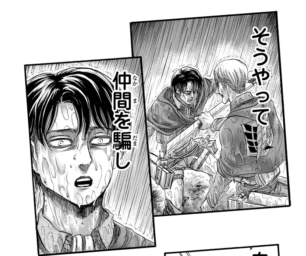 | 844 | Erwin Smith convinces Levi Ackerman to fight for the Survey Corps after Levi nearly takes Erwin's life.[95][96]