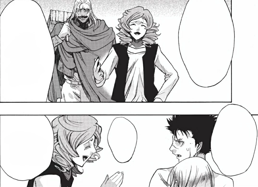 After passing through Trost District, the three finally arrive at the Industrial City. As they enter the city, Cardina and Kuklo observe that the Military Police Brigade seems to be on high alert for some reason. Jorge explains that this is because the Industrial City manufactures all of the weapons and equipment for the Military, and Cardina observes that the city is meant to protect against the Titan Cult and other such organizations. Kuklo asks Jorge what job his friend does in the city, but Jorge's explanation is interrupted by the arrival of Sharle Inocencio, who is thrilled to see Kuklo. As Kuklo and Sharle reunite, Cardina introduces himself, assuring Sharle that he wants to become her friend, now that their engagement has been cancelled.