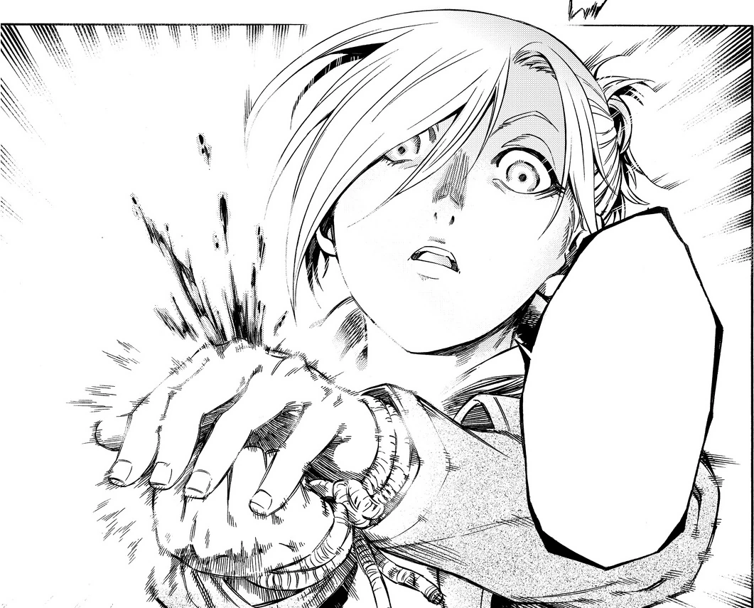 After Annie rushes to lock the door of Wayne Eisner's home, the angry neighbor leaves and Annie decides to report Wayne's death anonymously after she finds Carly Stratmann. Thinking back to when she learned of coderoin's origin in the capital, she wonders how it ended up in such high quantity with Wayne. When she heads to a carriage awaiting her, she is caught by Wald Richter and Lou Meade, a pair of hired handymen. After they restrain her and remove her silver ring, Annie asks them about their motives, and after vague answers, they tell her of their plan to kill her and dispose of her body in the industrial area of town. Annie asks for her ring back, and Wald discovers the little blade in her ring. He tests it for poison by pricking Annie's hand, just as she had planned. Generating an arm of the Female Titan and destroying the carriage, Annie is freed from her restraints and retrieves her ring.