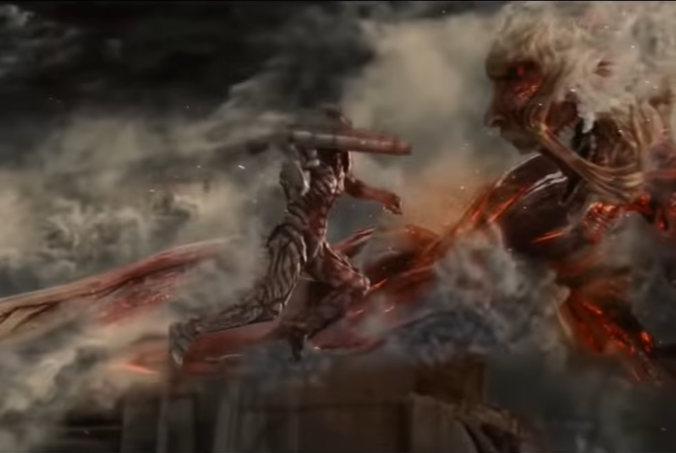 Some time later, it is revealed that the White Titan is the Titan form of Scout Regiment captain Shikishima. He reveals the secret behind the Titans to Eren but the two eventually come to blows in regards to handling the Titan threat in Monzen; this causes the captain to transform and attack the other Scout Regiment soldiers present. When several other Titans appear nearby, the White Titan easily punches through the head of one and tears out the spine of the other before focusing on Eren who transformed into his Titan form; the White Titan lands a severe kick to the side of the Mysterious Titan's head and is able to cause damage to both the arms as well. The White Titan continues attacking but is eventually overpowered by Eren's Titan using superior fighting abilities.